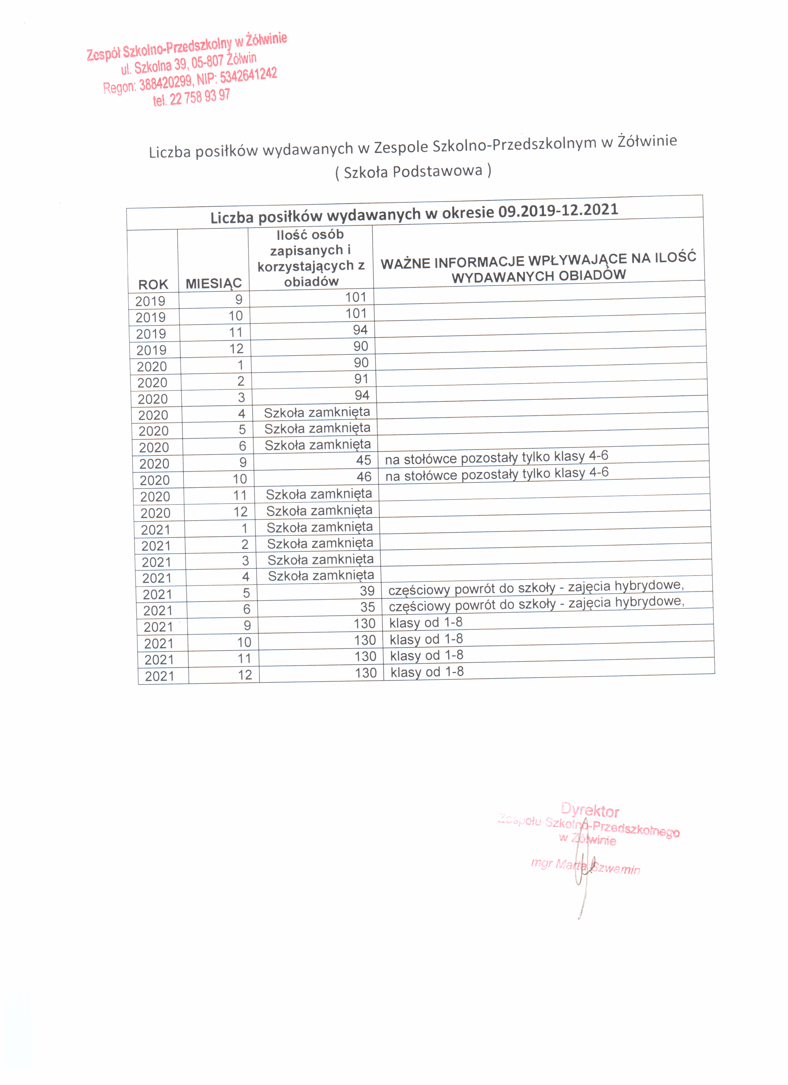 Zestawienie liczby posiłków wydawanych w szkole: Zestawienie liczby posiłków wydawanych w szkole
